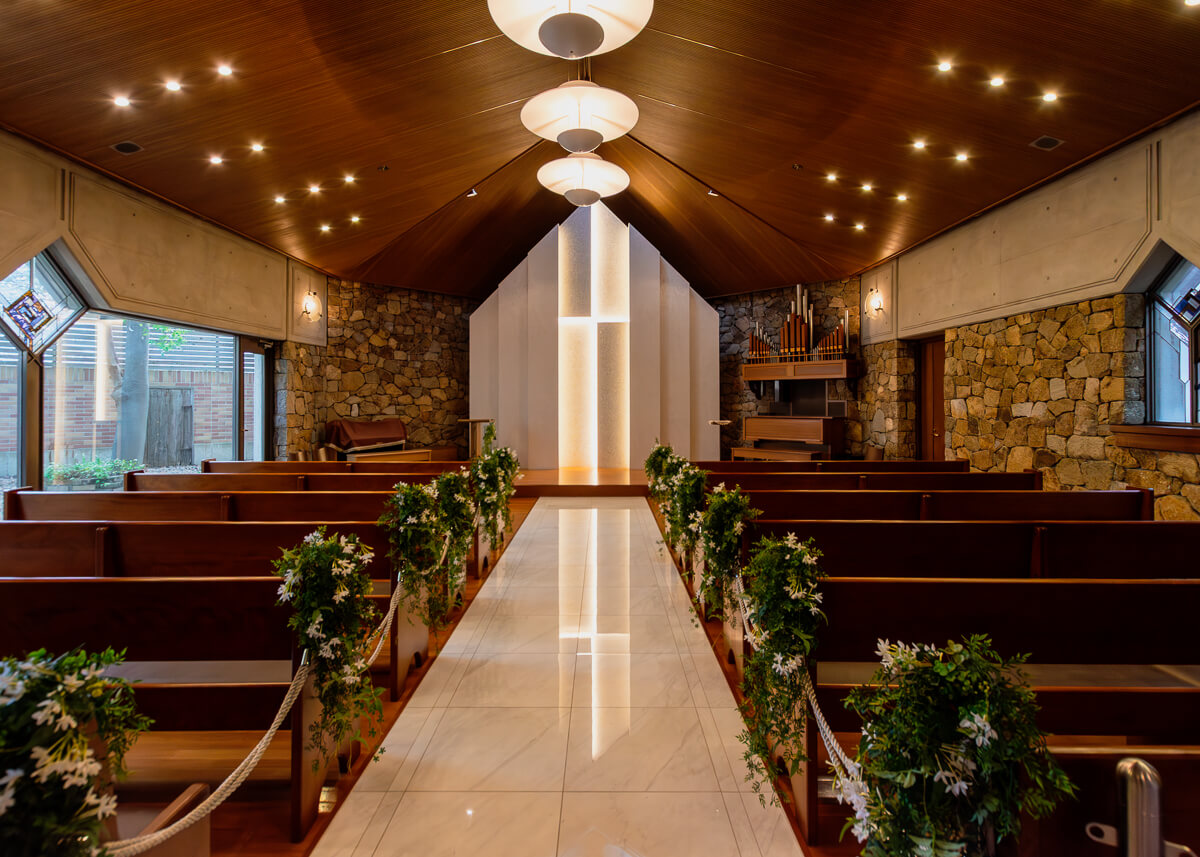 「まるで絵本の世界のような写真が撮れる」と称されるこのチャペルは、挙式だけでなくフォトウェディングのスポットとしても絶大な人気を誇ってきました。中央のバージンロードを照らす柔らかな光と、温かみのある木の質感が調和し、訪れる人を優しく包み込みます。閉館の日まで、この美しい空間は、北摂の地で紡がれる数々の物語を温かく照らし続けます。